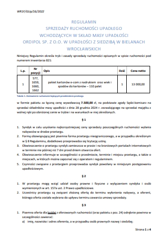 Przetarg w dniu 13.01.2026 r. o godzinie 16:30 w Kancelarii Restrukturyzacyjnej Sp. z o.o., ul. Fabryczna 6, 53-609 Wrocław. Wadium w kwocie 4.000 zł należy wpłacać na rachunek: 06 1930 1190 2220 0274 6320 0001. Oferty oraz wadium należy składać do 12.01.2026 roku lub osobiście na minimum 1 godzinę przed rozpoczęciem przetargu.